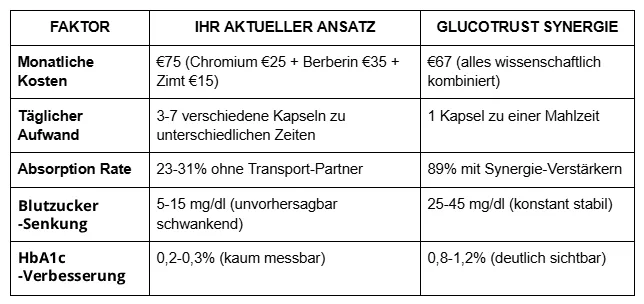 A: Das liegt an der "Transport-Katastrophe" bei Einzelnährstoffen. Chromium allein erreicht nur 23% Zellaufnahme ohne Transport-Partner. Berberin allein hat nur 31% Bioverfügbarkeit ohne Verstärker. GlucoTrust nutzt wissenschaftliche Transport-Optimierung: Piperin steigert Berberin-Aufnahme um 116%, Vitamin C verbessert Chromium-Transport um 287%. Ergebnis: Dreifach höhere Wirksamkeit.