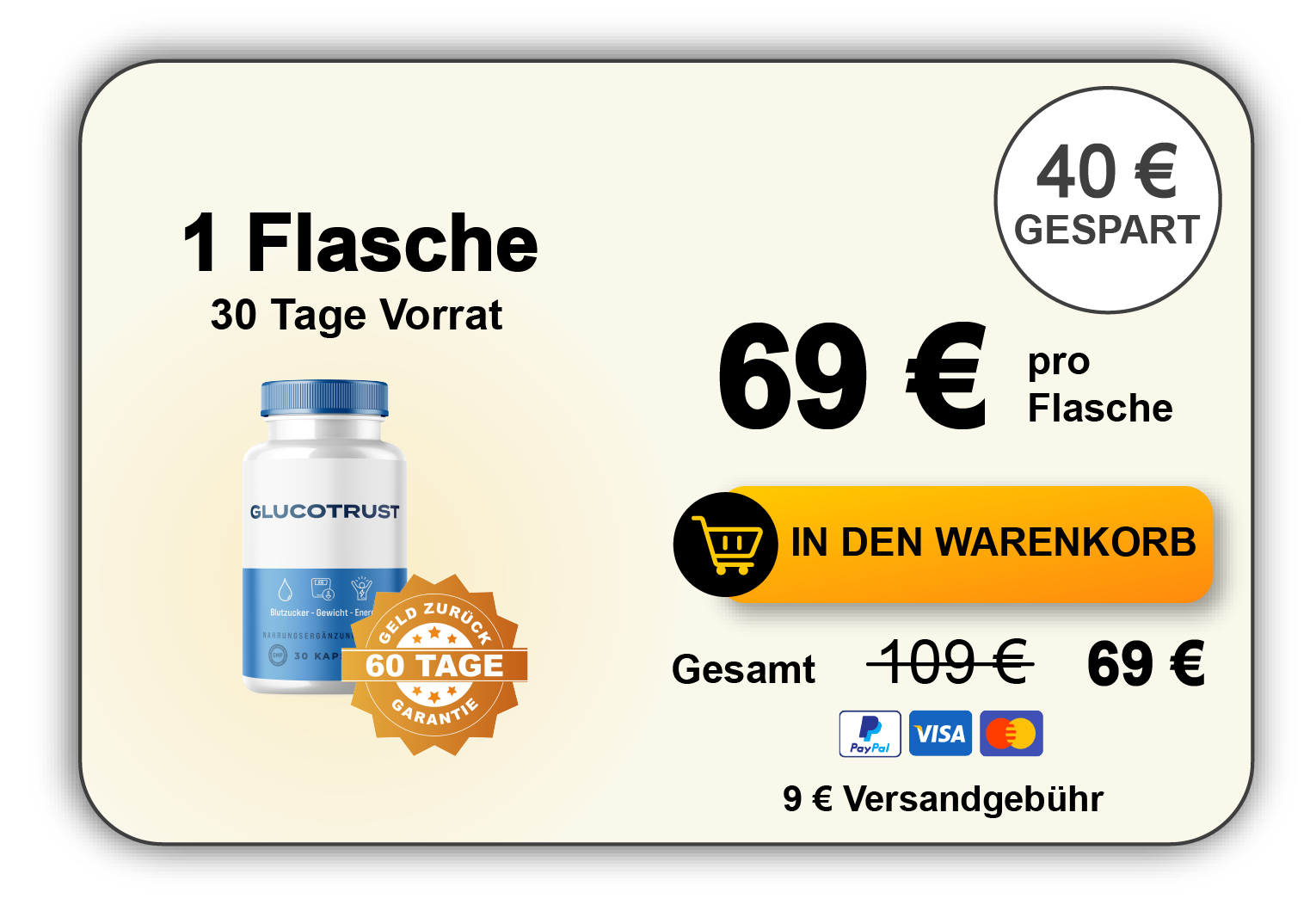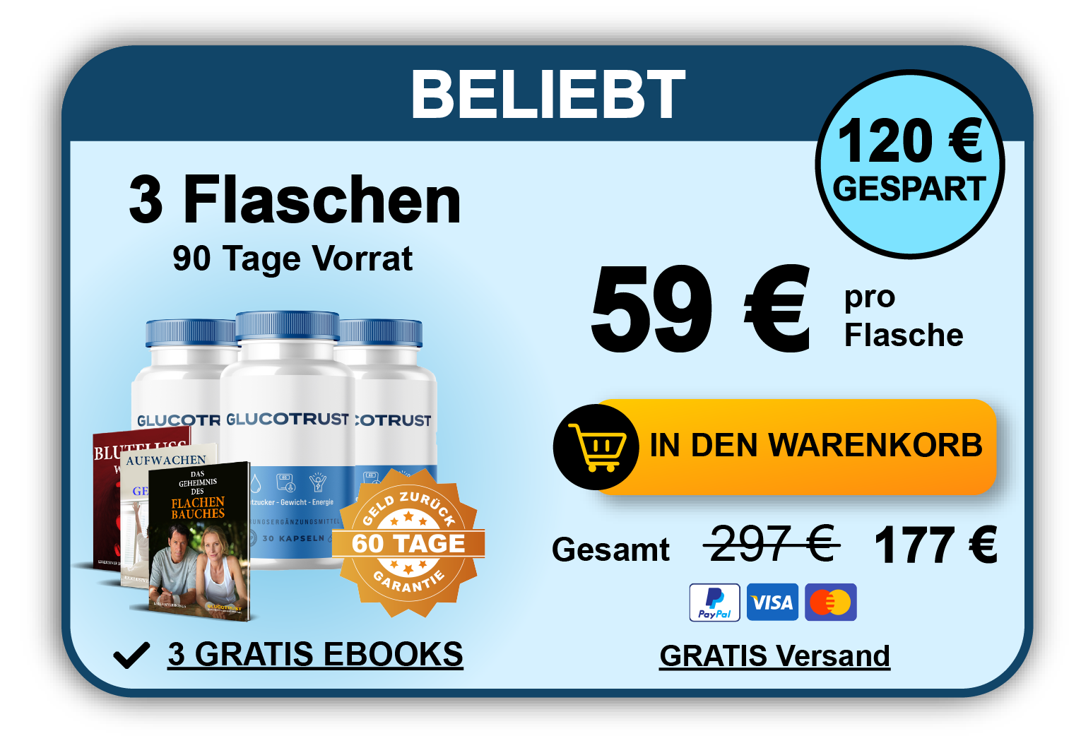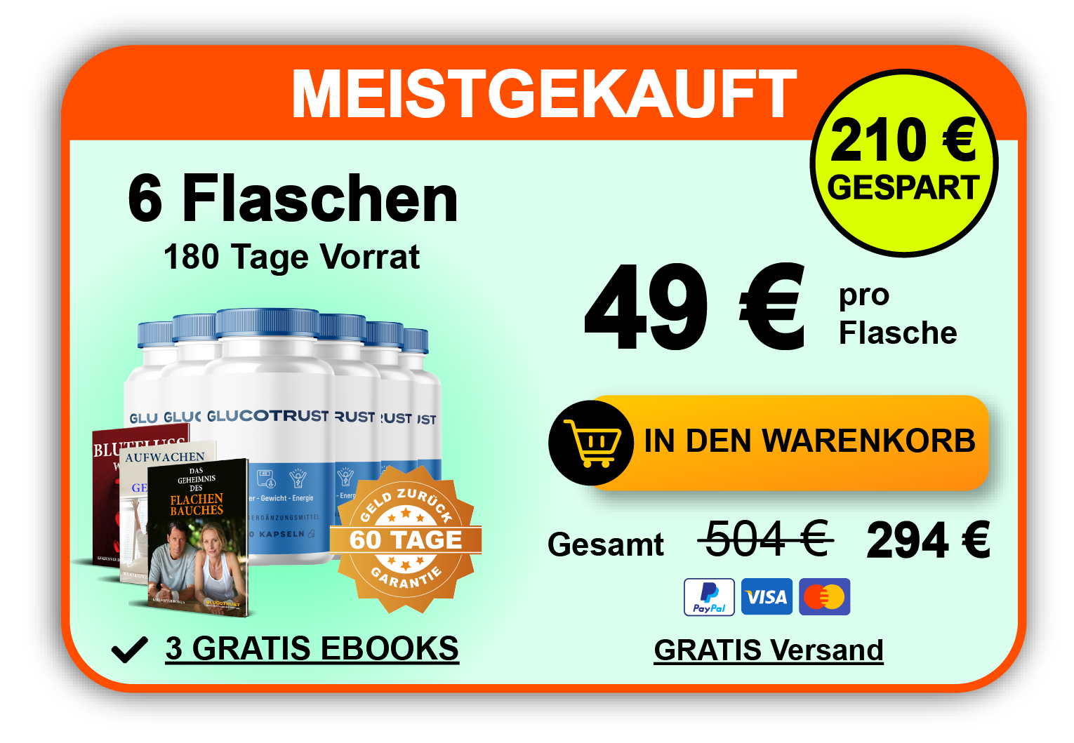 Natürlich können Sie auch nur eine Flasche (einen 30-Tage-Vorrat) bestellen und Sie werden sich innerhalb weniger Wochen so gut fühlen, dass Sie mehr bestellen möchten... aber der Vorrat ist schnell ausverkauft und einige der Inhaltsstoffe von GlucoTrust sind schwer zu beschaffen. Es kann jederzeit passieren, dass wir keine Vorräte mehr haben. Wenn Sie heute drei oder sechs Flaschen bestellen, ist der Versand kostenlos und Sie erhalten kostenlose Boni im Wert von €250!